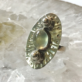 This oval kyanite gemstone is a handcrafted silversmith ring with a generous size oval cabochon set in both .925 sterling silver & .999 fine silver.
