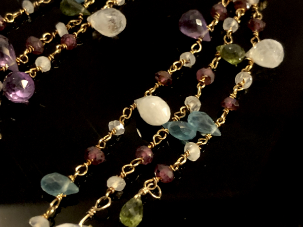 Apatite, Peridot, Amethyst, Rainbow Moonstone Triple Strand Wire Wrapped Earrings is a stunning pair of delicate gold filled handmade earrings with 4mm peridot faceted roundels, 4mm amethyst faceted roundels, 4mm rainbow moonstone faceted roundels, suspended from 14K gold fill hand made chain that will simply take your breath away. Suspended from the end of the fringe are three beautiful faceted 3-6mm moonstone, peridot and amethyst briolettes.
