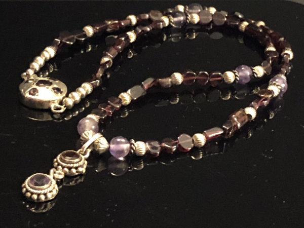 Garnet rectangles and coins, Amethyst rounds have been designed with a generous amount of sterling silver for a stunning backdrop to the gorgeous Garnet & Amethyst pendant I found on a vacation to a coastal city in Mexico many years ago. This combination makes a beautiful necklace for any occasion. The necklace was finished with sterling silver crimp beads ensuring strength and durability, the crimp beads have been covered with sterling silver crimp covers giving a smooth finished look to your necklace.