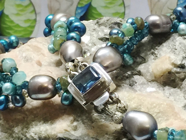 This stunning multi strand necklace is designed using simply stunning Peruvian Blue chalcedony smooth heart briolettes, 5mm Peruvian Opal roundels, Silver Gray Peacock freshwater pearls, 6mm sea green teal freshwater pearl buttons, 6mm freshwater pearl teal rice blisters, 3mm Light Topaz bicones, 4mm London blue quartz faceted roundels that have been woven with soft flex beading wire and protected from wear with silver wire guards attached to a sterling silver blue topaz rectangle box clasp. The London blue quartz, Peruvian roundels and sea green freshwater pearl buttons are wire wrapped with sterling silver headpins forming lush handmade fringe clusters for the pendant. The length is 20" + 1" pendant.