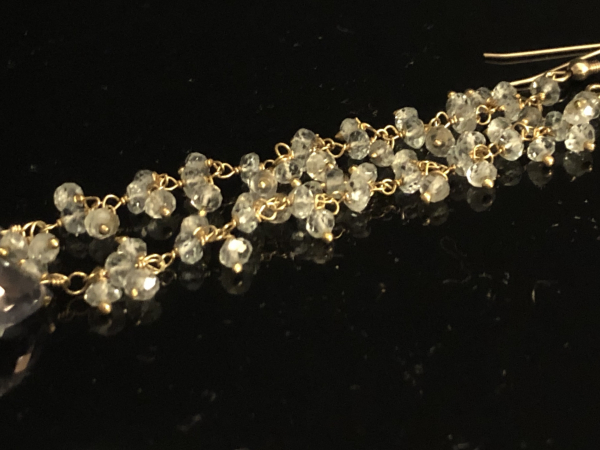 Sky Blue Topaz & Mystic Topaz Wire Wrapped Fringe Shoulder Sweep Earrings is a stunning pair of delicate gold filled handmade earrings with 4mm blue aquamarine faceted roundels and 11mm mystic topaz tear drop briolettes suspended from 14K gold fill hand made chain that will simply take your breath away.